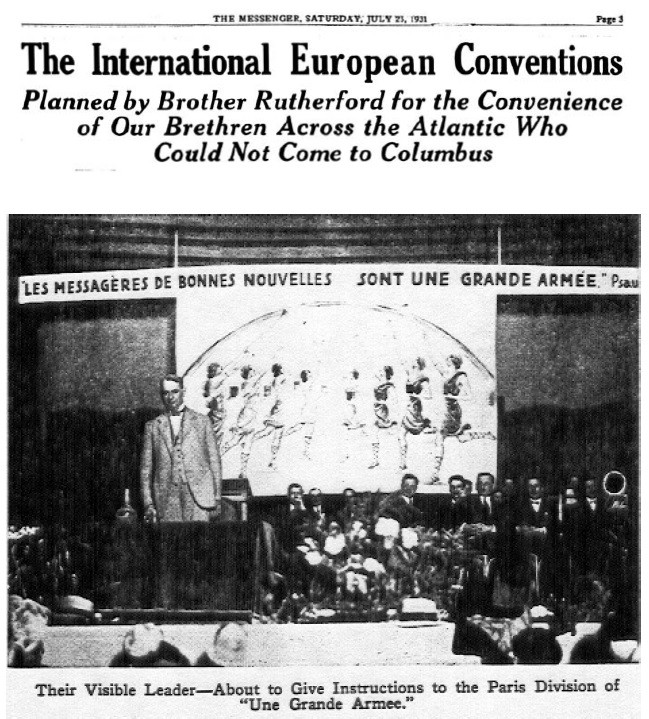 Considere las fotos en estas páginas y sus subtítulos copiados de The Messenger (El Mensajero), un informe de asamblea de la Watch Tower, del 25 de julio de 1931, que describe una asamblea grande en aquel año celebrada en ciudades mayores de Europa. Los subtítulos al pie de las fotos son los originales hallados en The Messenger. Compárelos con el subtítulo que el escritor del libo de historia de la Sociedad colocó debajo de la foto vista en la página anterior afirmando que “los Testigos sabian que [Rutherford] no era su líder (caudillo).”