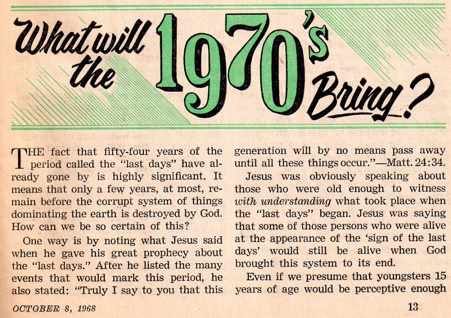 ‘But what do we have today as we approach 1975? Conditions have not been peaceful. We’ve been having world wars, famines, earthquakes, pestilences and we have these conditions still as we approach 1975. Do these things mean something? These things mean that we’re in the “time of the end.” And the end has to come sometime. Jesus said: “As these things start to occur, raise yourselves erect and lift your heads up, because your deliverance is getting near.” (Luke 21:28) So we know that as we come to 1975 our deliverance is that much nearer.’