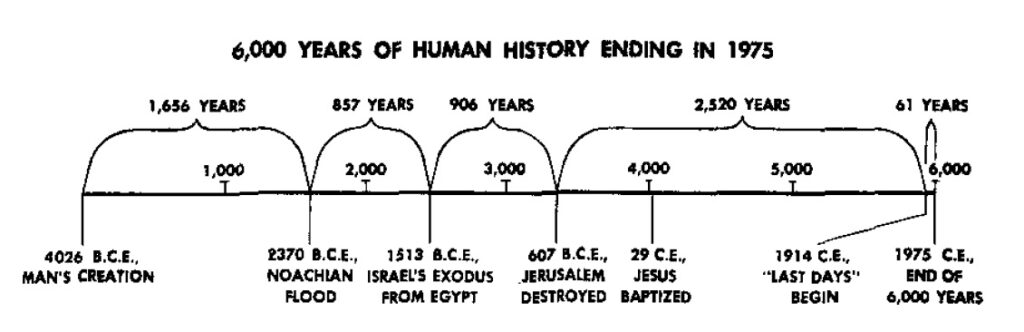 … Interestingly, the autumn of the year 1975 marks the end of 6,000 years of human experience. This is ascertainable from reliable chronology preserved in the Bible itself. What will that year mean for humankind? Will it be the time when God executes the wicked and starts off the thousand-year reign of his Son Jesus Christ? It very well could, but we will have to wait to see. Yet of this we can be certain: the generation that Jesus said would witness those events is nearing its close. The time is close at hand. On God’s “timetable” we are in the closing days of a wicked system of things that will soon be gone forever. A glorious new order is immediately before us. This is, therefore, good reason for Christians everywhere to rejoice. Yes, they rejoice because fulfillment of their prayers for the kingdom of God is now at hand.