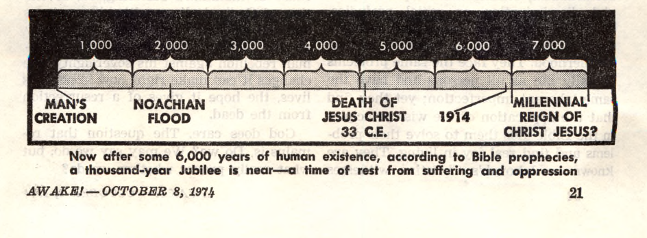 OUR generation will see the end of the present pressure-ridden order. In fact, there is even good reason to hope that a new order of God’s making may begin within the present decade… The Bible shows that we are nearing the close of 6,000 years of human history. Bible chronology reveals that human life began with Adam’s creation some 4,058 years before the death of Jesus (in the spring of the year 33 C.E.). By adding to this the years from Jesus’ death till now, we find that the completion of 6,000 years of man’s existence will come near the middle of this decade of the 1970’s… So, as we draw close to the completion of six thousand years of human existence during this decade, there is the thrilling hope that a grand Sabbath of rest and relief is indeed at hand.