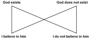 The vertical lines represent correct beliefs, the diagonals represent incorrect beliefs. Let us compare the diagonals. Suppose God does not exist and I believe in him. In that case, what awaits me after death is not eternal life but, most likely, eternal nonexistence. But now take the other diagonal: God, my Creator and the source of all good, does exist; but I do not believe in him. He offers me his love and his life, and I reject it. There are answers to my greatest questions, there is fulfillment of my deepest desires; but I decide to spurn it all. In that case, I lose (or at least seriously risk losing) everything.