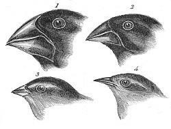 Popular View: The finches found in the Galapagos Islands and on Cocos Island during Darwin’s five-year voyage (1831-1835) on the H.M.S. Beagle are often referred to in textbooks as being influential in helping him to formulate his theory of evolution. Later observations conducted during the 1970s on the variations in beak sizes among the fourteen species of finches are considered to be evidence for the theory. [Image: Darwin’s finches or Galapagos finches. Darwin, 1845. Journal of researches into the natural history and geology of the countries visited during the voyage of H.M.S. Beagle round the world, under the Command of Capt. Fitz Roy, R.N. 2d edition. Categories represented: 1. Geospiza magnirostris, 2. Geospiza fortis, 3. Geospiza parvula, now Camarhynchus parvulus and 4. Certhidea olivacea.].