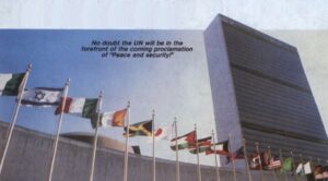 [Imagem da revista A Sentinela de 1 de setembro de 1987, pág. 18. Tradução: Sem dúvida, a ONU estará na dianteira da vindoura proclamação: “Paz e segurança!”]