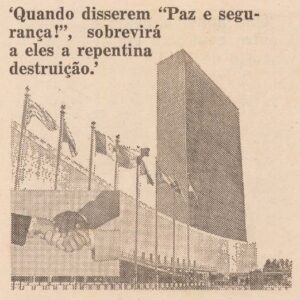 “Um desses acontecimentos foi profetizado pelo apóstolo Paulo, quando declarou: “Vós mesmos sabeis muito bem que o dia de Jeová vem exatamente como ladrão, de noite. Quando estiverem dizendo: ‘Paz e segurança!’ então lhes há de sobrevir instantaneamente a repentina destruição.” Esta profecia torna claro que, logo antes do fim deste sistema de coisas, declarar-se-á de forma excepcional “paz e segurança”, quer mediante as Nações Unidas, quer independentemente pelos líderes políticos e religiosos. O que se seguirá a essa declaração? Paulo disse: “Então lhes há de sobrevir instantaneamente a repentina destruição.” (A Sentinela de 15 de novembro de 1984, página 6. Imagem abaixo.)