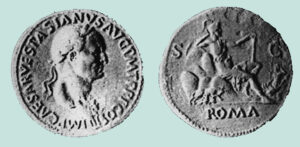 Mynt från Kejsar Vespasianus regering (69-79 e.Kr.) Framsidan t.v. visar Vespasianus. Baksidan t.h. framställer staden Rom under bilden av stadsgudinnan Roma sittande på sju kullar.