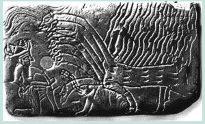 Lertavlan är från sumerisk tid och har daterats till ca 2600 f.Kr Den visar en knäböjande hjälte som angrips av ett sjuhövdat monster med lejonkropp. Ett av huvudena har fått ett slag eller hugg och hänger ner. Vilddjur med sju huvuden är en urgammal symbol.Jfr Upp. 13:3
