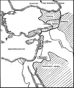 Vasallriken i östra medelhavsområdet på 60-talet e Kr: Bosporiska riket, Pontus, Armenien, Lilla Armenien, Commagene, Kilikien, Itureen, Homs, Arqa (Libanon) och Nabateerriket (Ur Eliezer Paltiel, Vassals and Rebels in the Roman Empire, 1991, s. 321-330)